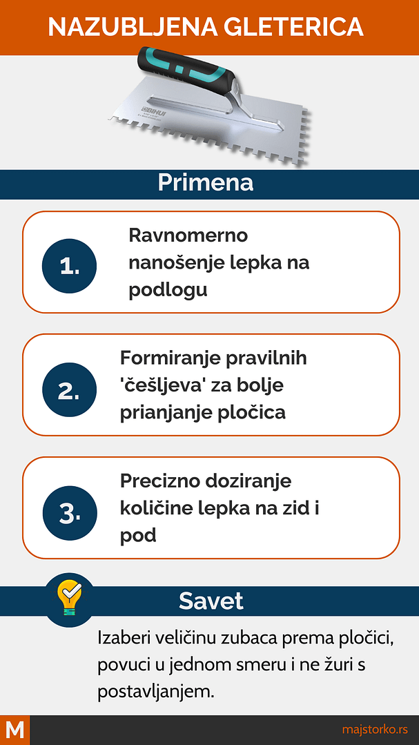 Veličina zubaca (obično 6, 8 ili 10 mm) zavisi od veličine i vrste pločica. Manji zub za manje pločice (kuhinja, zid), veći za pod i terasu. Pribor za keramiku bez ove gleterice je kao vožnja bez volana. Rezultat je neuredan, kratkog daha i lošeg izgleda.