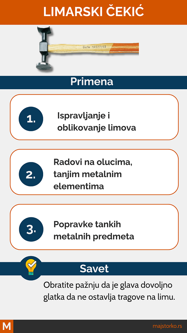 Limarski čekić je izrađen specifično za rad sa tankim metalima, poput limova, žica i alata koji zahteva precizno oblikovanje. Po izgledu ima jednu spljoštenu i drugu suženu stranu, što omogućava različite tehnike udaranja i savijanja. Upotreba čekića ovog tipa tipična je za popravku limenih oluka, automobila, garažnih vrata i sličnih elemenata u domaćinstvu. Kada se traži odgovarajući alat za kućne popravke na tankim metalima, limarski čekić je gotovo nezamenljiv.