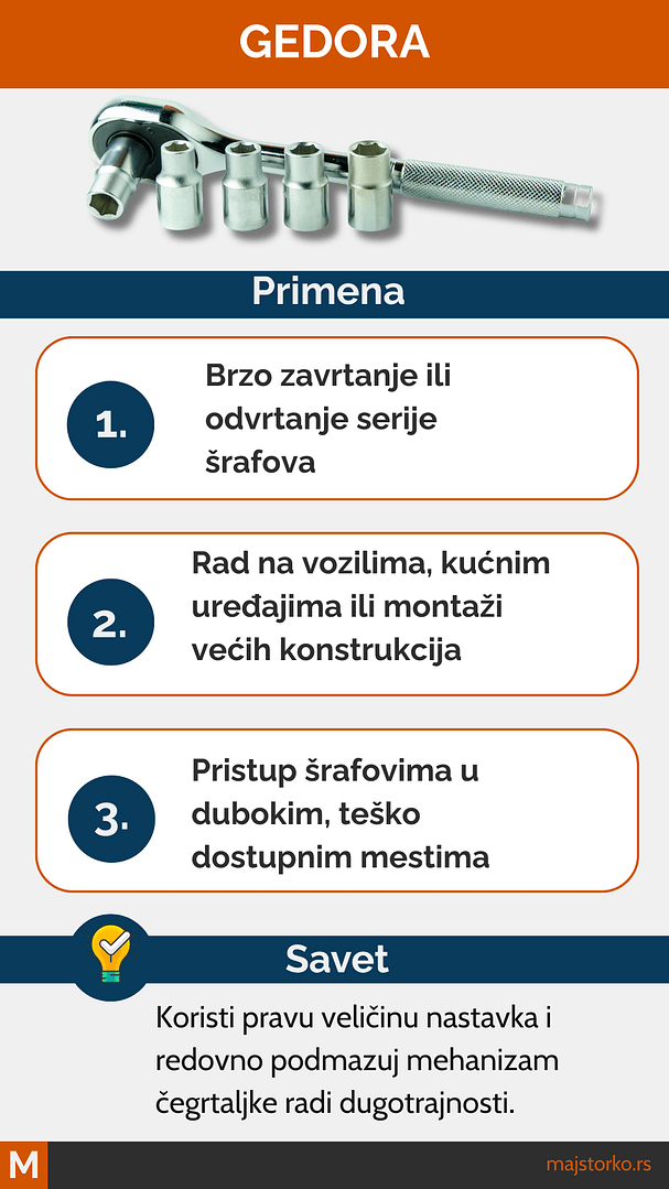 Gedora, kao alat za rad sa šrafovima, omogućava rad jednom rukom, rad pod uglom, korišćenje produžetaka i rad u skučenim prostorima. Ove vrste ključeva najčešće se prodaju kao setovi sa raznim veličinama čaura i nastavaka. Dodatna prednost je i reverzibilni mehanizam koji ubrzava montažu i demontažu. Ključevi za šrafove kao što su gedore su neophodni za svakog ko ozbiljnije popravlja ili servisira automobile.